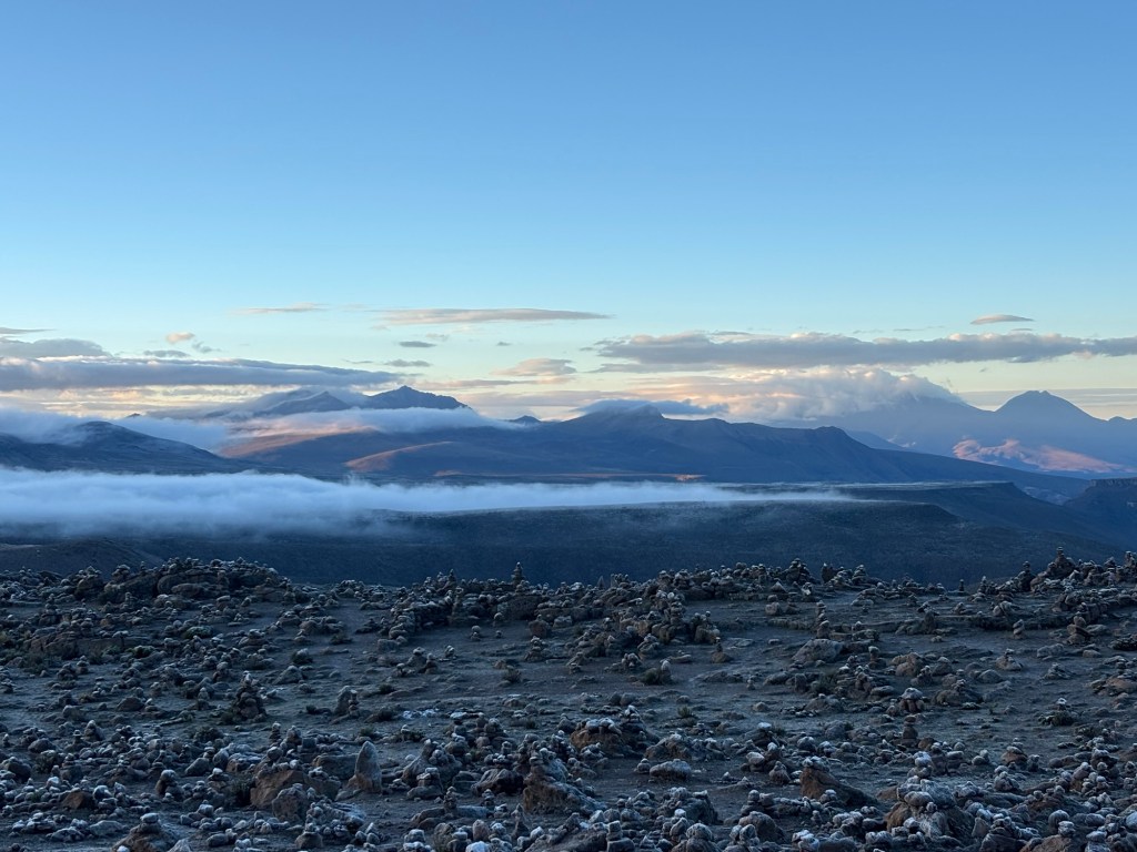 Today’s journey took me up into the Andes for the first time. We stopped at a mirador some 4.910 metres above sea level, which is easily the highest I’ve ever climbed in my life – and this isn’t even the Andes proper. The ground was covered in a thin layer of frost, turning the many hundreds of stone cairns all around into petrified snowmen. A few hardy native women wrapped up from head to toe in colourful scarves were bravely plying their wares to each and every bus that stopped by – which, this being Good Friday and thus a national holiday, was no small number.