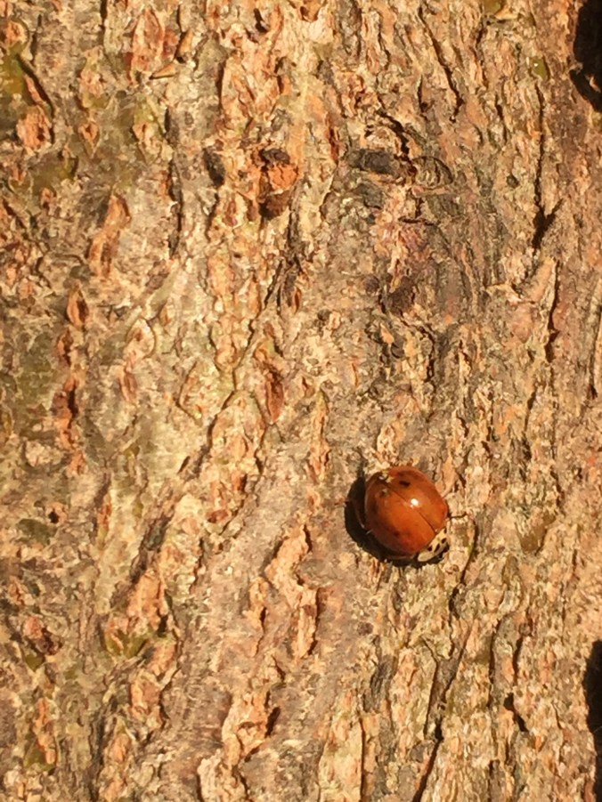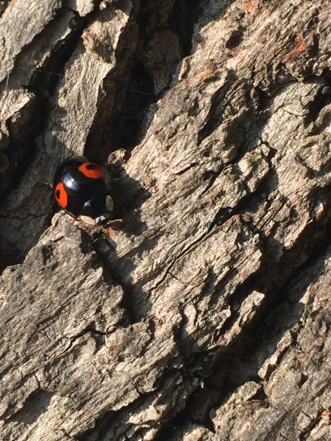 I can see a ladybird on the bark. It’s not the kind you grew up with in kids’ picture books, post-box red with big black spots. It’s beetle-black with two red eyes, giving its wing-cases the impression of a cartoonish snake’s head viewed from above.