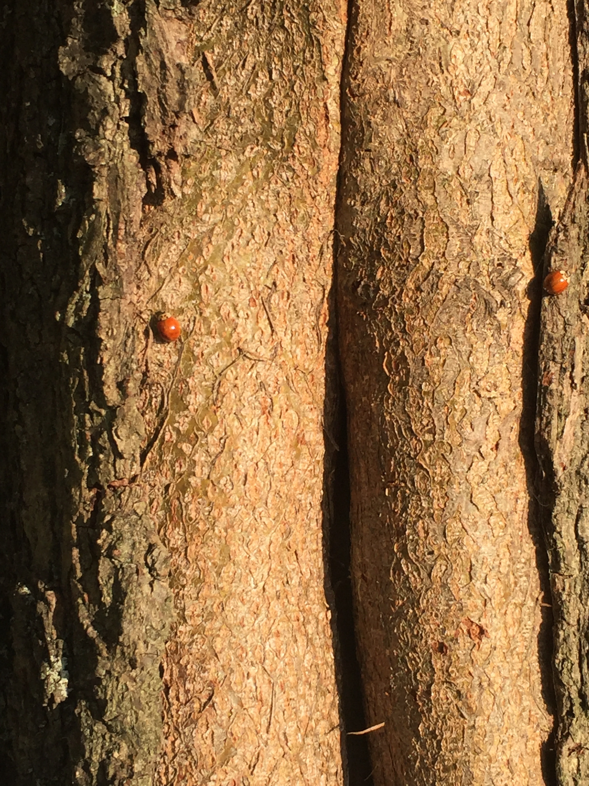 I don’t think I’ve ever seen a ladybird like that before. Point of fact, I don’t think I’ve seen any of the ladybirds on this tree before either. There are yellow ladybirds with twenty spots or more. Red or orange ladybirds with no spots at all. I believe these might be the so-called harlequins, invading ladybirds from distant Asia. Up and down the trunk they go, in that apparently directionless march that beetles seem to adopt, racing in and out of the grooves in the bark. One stops. Its wings click open in a single motion, like the safety-catch on a gun, and then it takes off from the tree into the sunlight. As it goes, another arrives, jet black with those two red eyes like the first one.