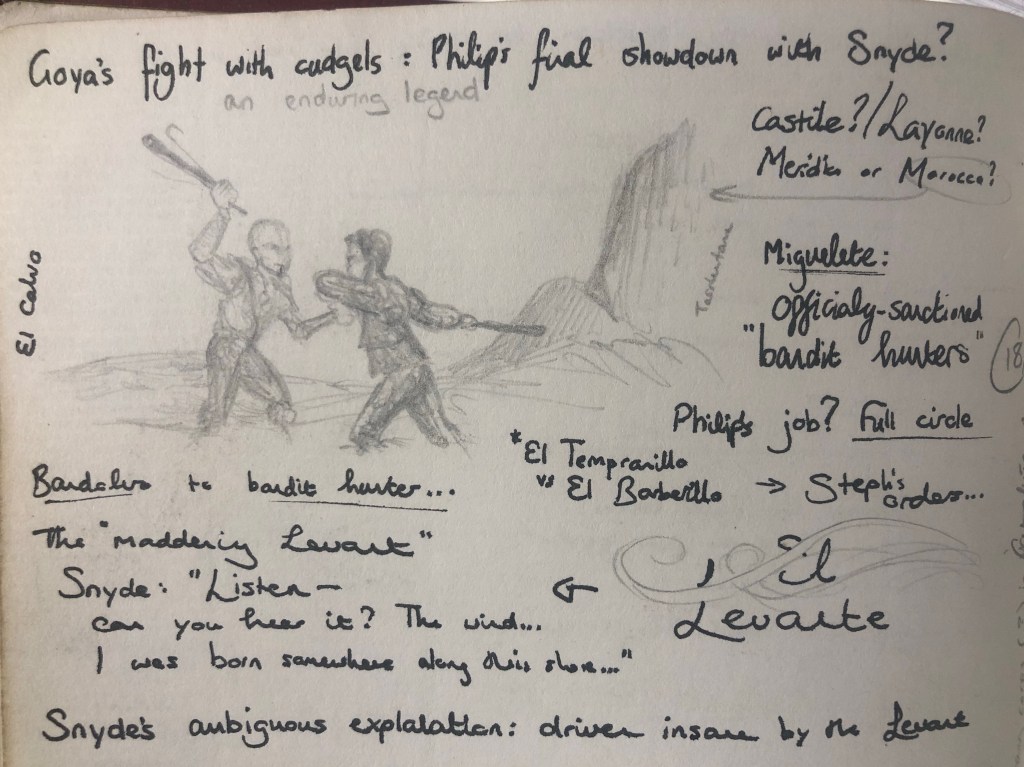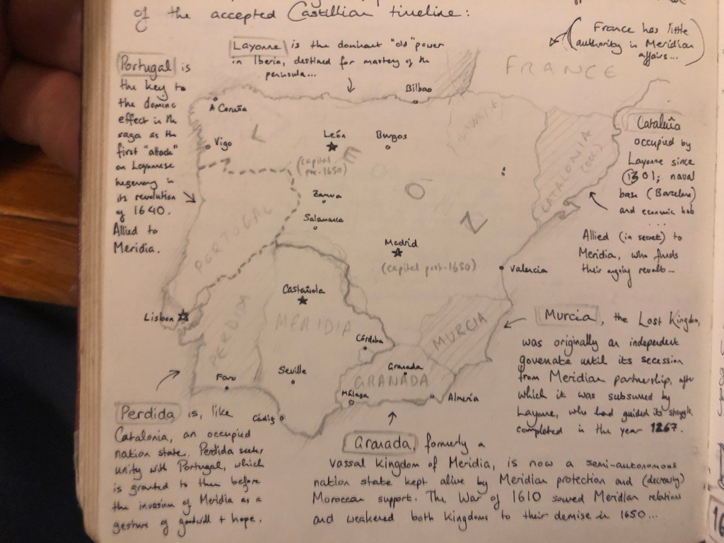 Here’s the same map, drawn about a year later. It’s the eighth of a total of ten maps of the peninsula in the same journal (when students ask me how I can draw a map of Spain from memory… this. This is how). It’s probably the most accurate, and the one I still use today when mapping out the events of the saga, the exception being the retroactive introduction of the “corredor cordobés” that cuts a swathe from Córdoba to the city of Cádiz, separating Meridia from Granada and providing a political flashpoint for the plot. Ringing the map, you can see the history I’ve had to build up around it. I tell you, writing a historical novel is one thing, but writing allohistory – that is, an alternative timeline – is a messy, time-consuming business. If I didn’t keep a journal, I doubt I’d remember all the details. Nevertheless, they’re absolutely essential to giving your world an identity of its own, just as the “Greatest Generation” and the “fight them on the beaches” speech are integral parts of our collective memory.