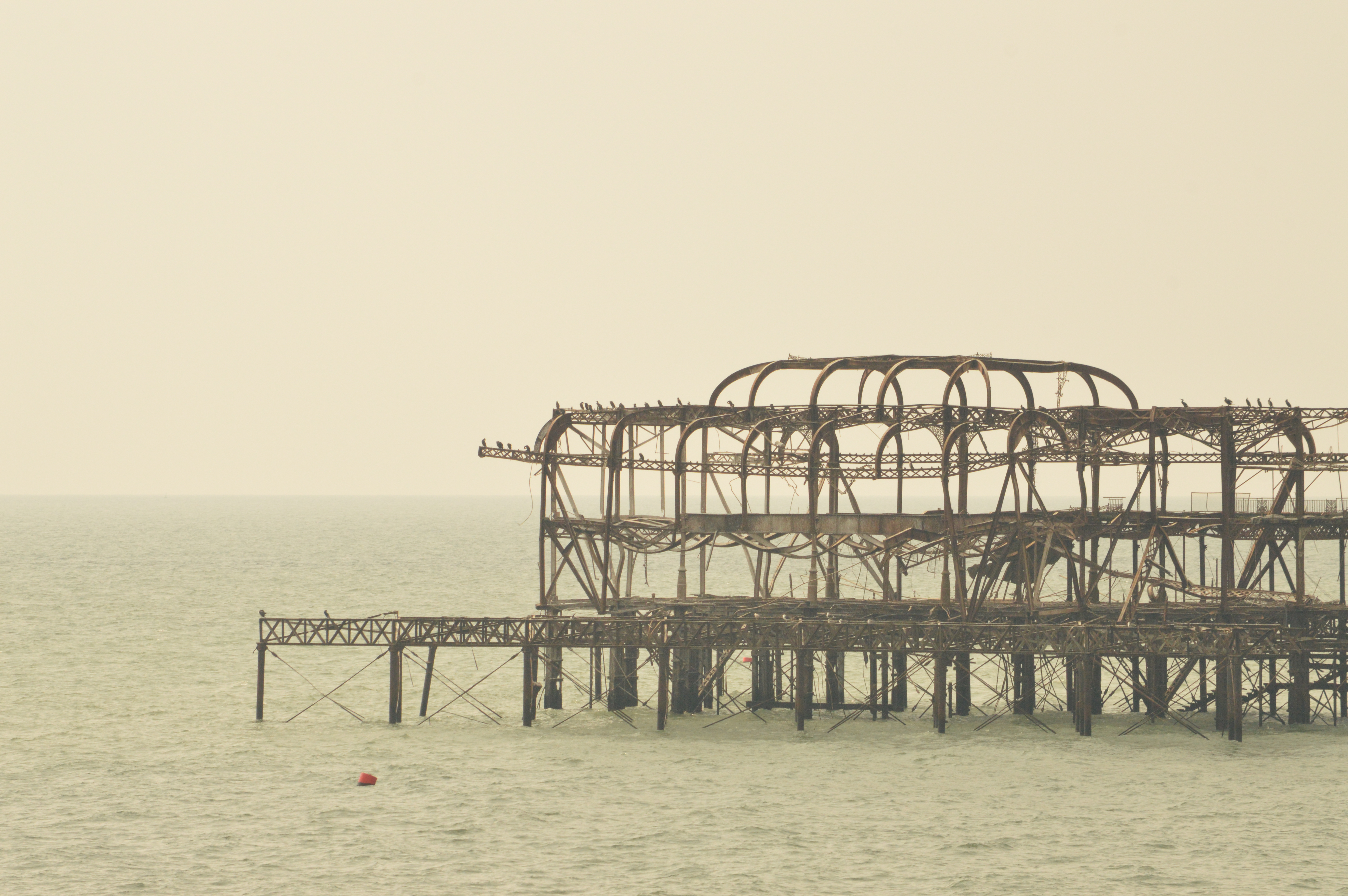 There’s a quiet spot behind one of the rides, looking out towards the mouldering wreck of the old pier. Seen from its sister with the city behind it, the Western Pier looks small and unimpressive. From the shore it looks a little more mysterious, where its mangled skeleton claws at the horizon like the blackened bones of a giant, mechanical whale, picked clean by the cormorants that sit on its ancient struts. In their oil-black funeral garb, they might as well be an extension of the wreckage. Brighton’s gargoyles.