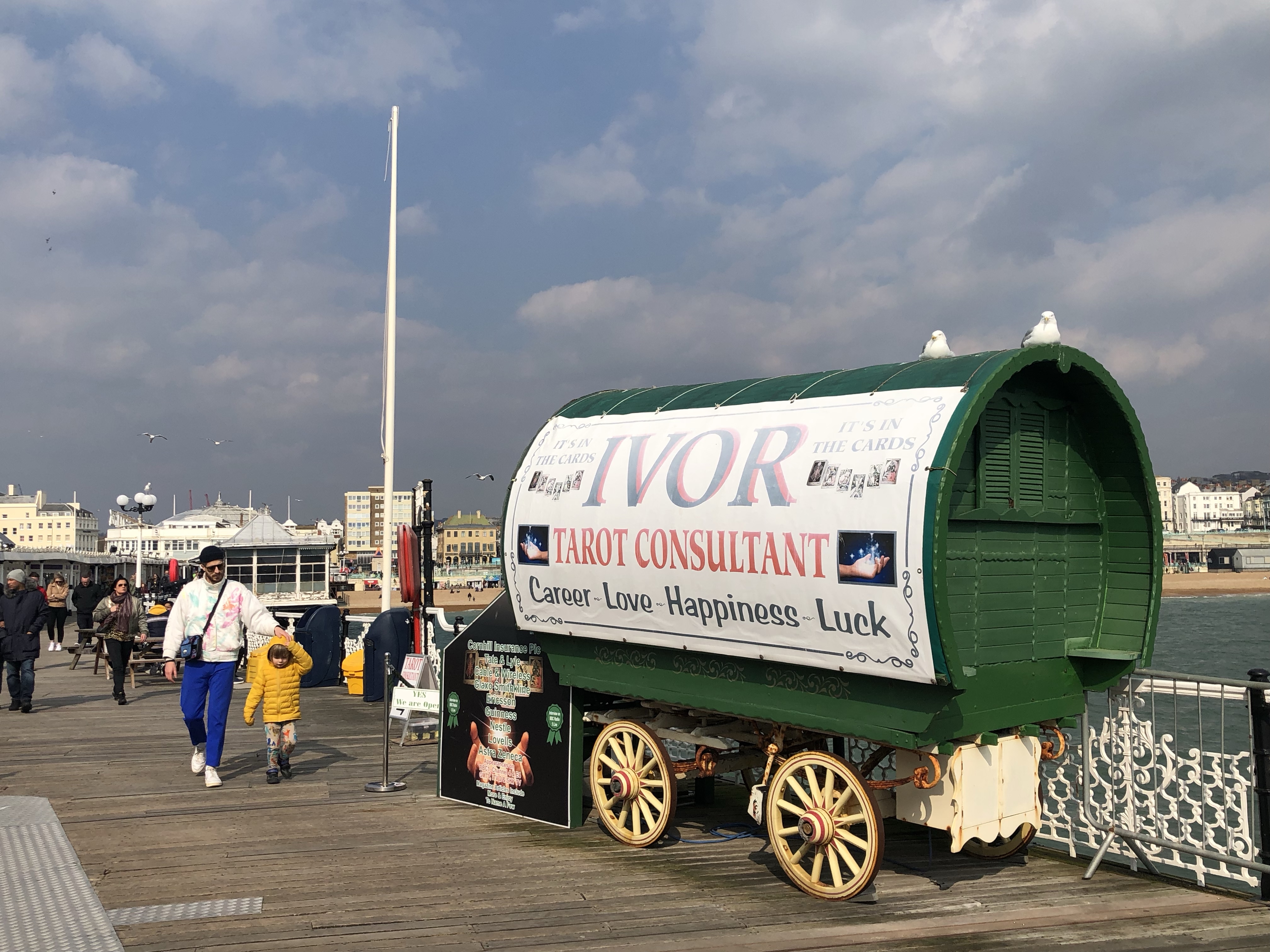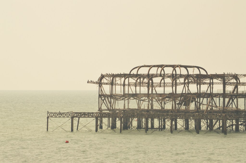 2:45pm, 20th March. I’m sitting on a bench on Brighton’s Palace Pier, sheltering for a moment from the wind. A sign in front of me reads “It’s fun all year on Brighton Pier”. Somewhere down the coast to the east, there’s a few mad folk towelling off after a swim. The sea doesn’t exactly look inviting today. I look down through the slats. The bottle green waters of the Channel heave and swell about the centipede legs of the pier below. I wonder what creatures of the deep might be looking back up at me, besides the silent starfish in the silt.