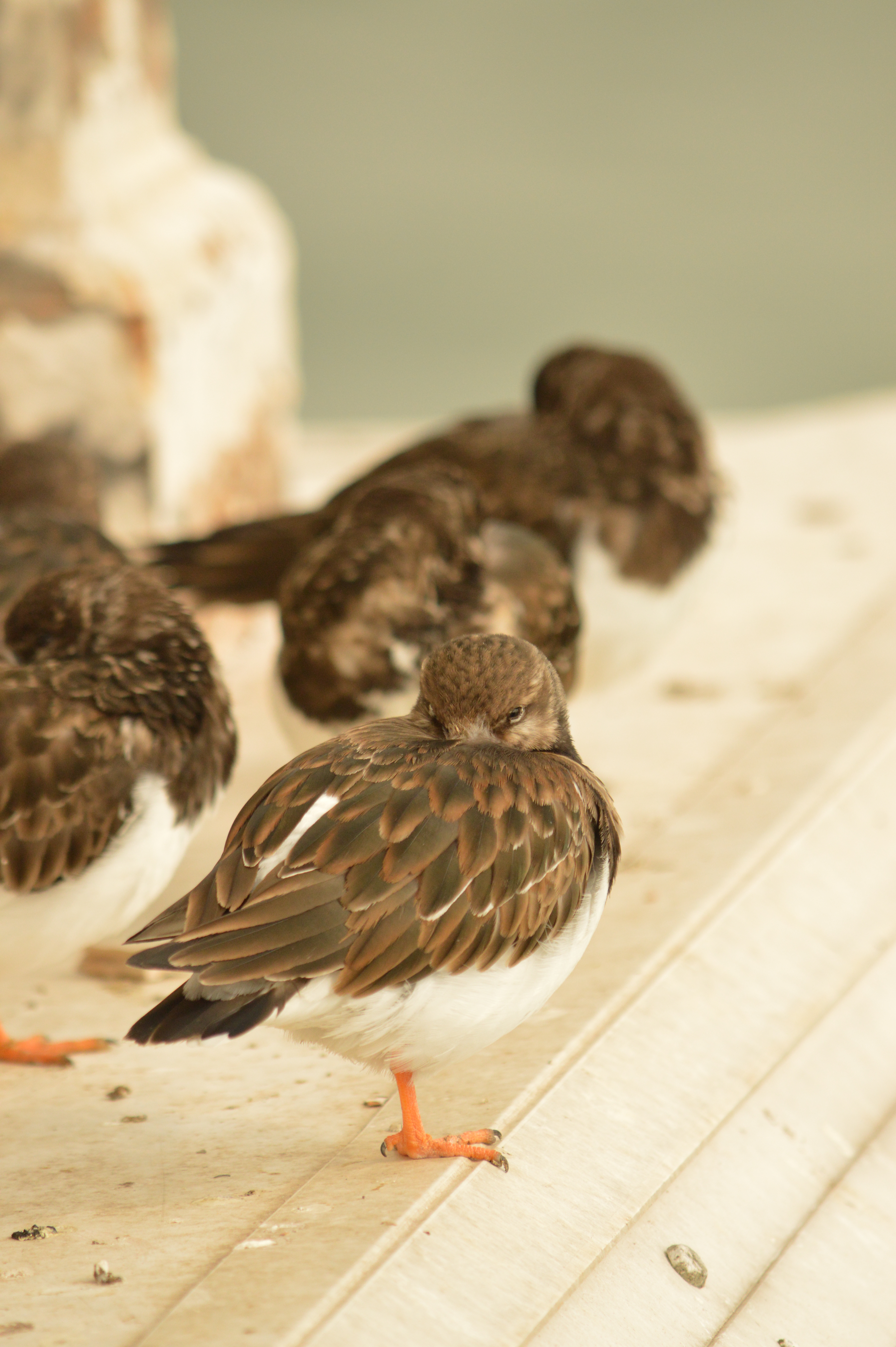 Behind the Tin Can Alley shack, a huddle of turnstones get some shut-eye. These often hyperactive creatures look out of place when static, and one wonders how they manage to get any rest at all with the thumping bass from the fairground rides at the end of the pier. It almost looks as though there’s a physical pecking order to the clan, and the ones at the bottom aren’t having much luck, hopping from strut to strut with remarkable dexterity. A passer-by sees what I’m looking at and stops to take a few photographs on her phone. The turnstones don’t seem to be fazed by me, or her, or any of this. After all, it’s fun all year on Brighton Pier. They’re probably used to it.