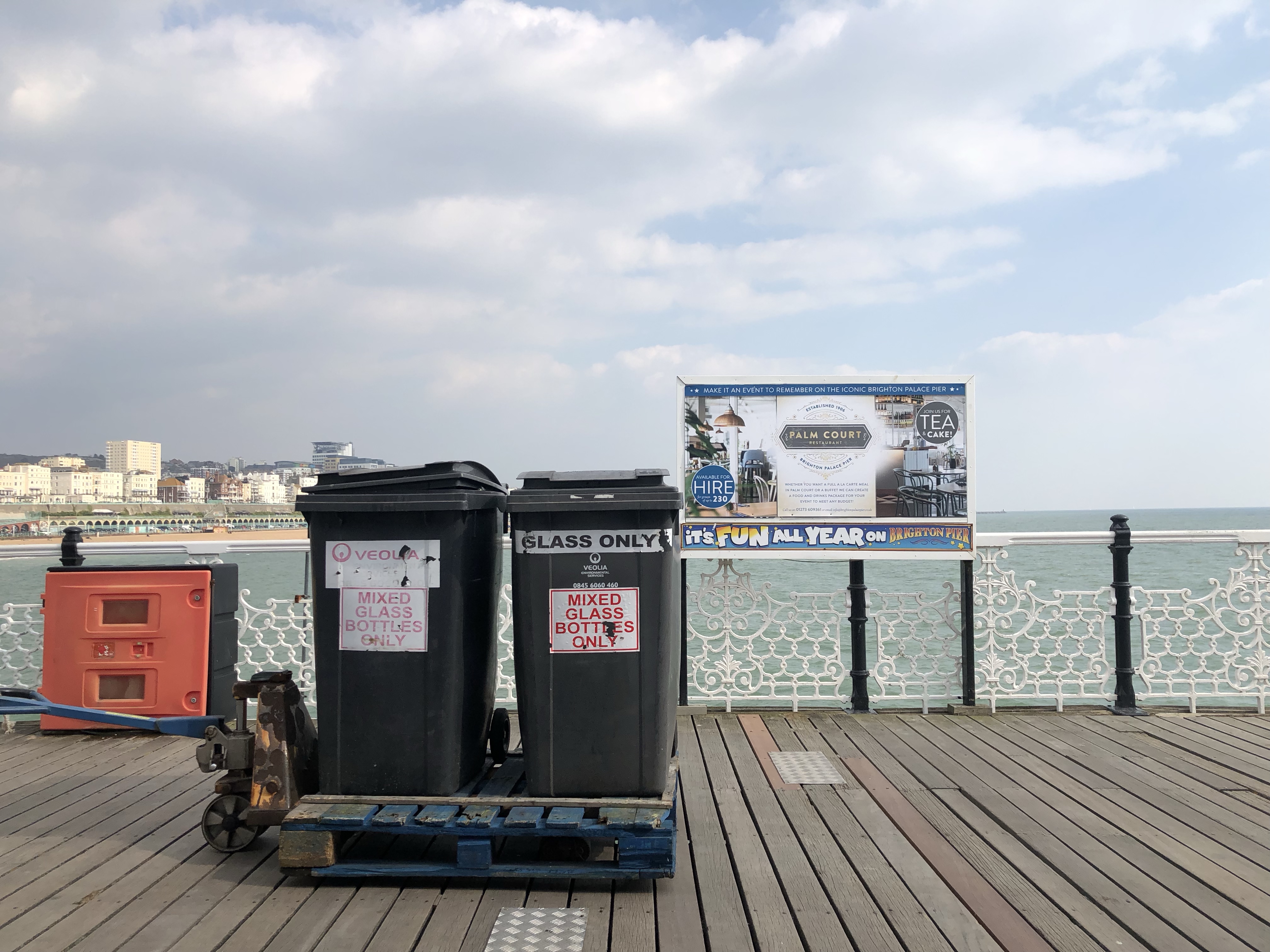 A few seconds later, a herring gull lands on the parapet. It’s not there for long, as a gang of girls in tracksuits race up the aisle towards the gloom of the arcade, screaming and swearing, sending the panicked bird into the air in their wake. Two scavengers in a truck trundle by in the opposite direction, trailing two heavy GLASS ONLY bins behind them. The planks tremble beneath my feet. I imagine, for a moment, the structure collapsing beneath its weight. In slow motion I see the bins rolling over backwards and a cascade of bottles plummeting into the sea below, some of them shattering on the struts of the pier before they hit the water. I have a pretty active imagination.