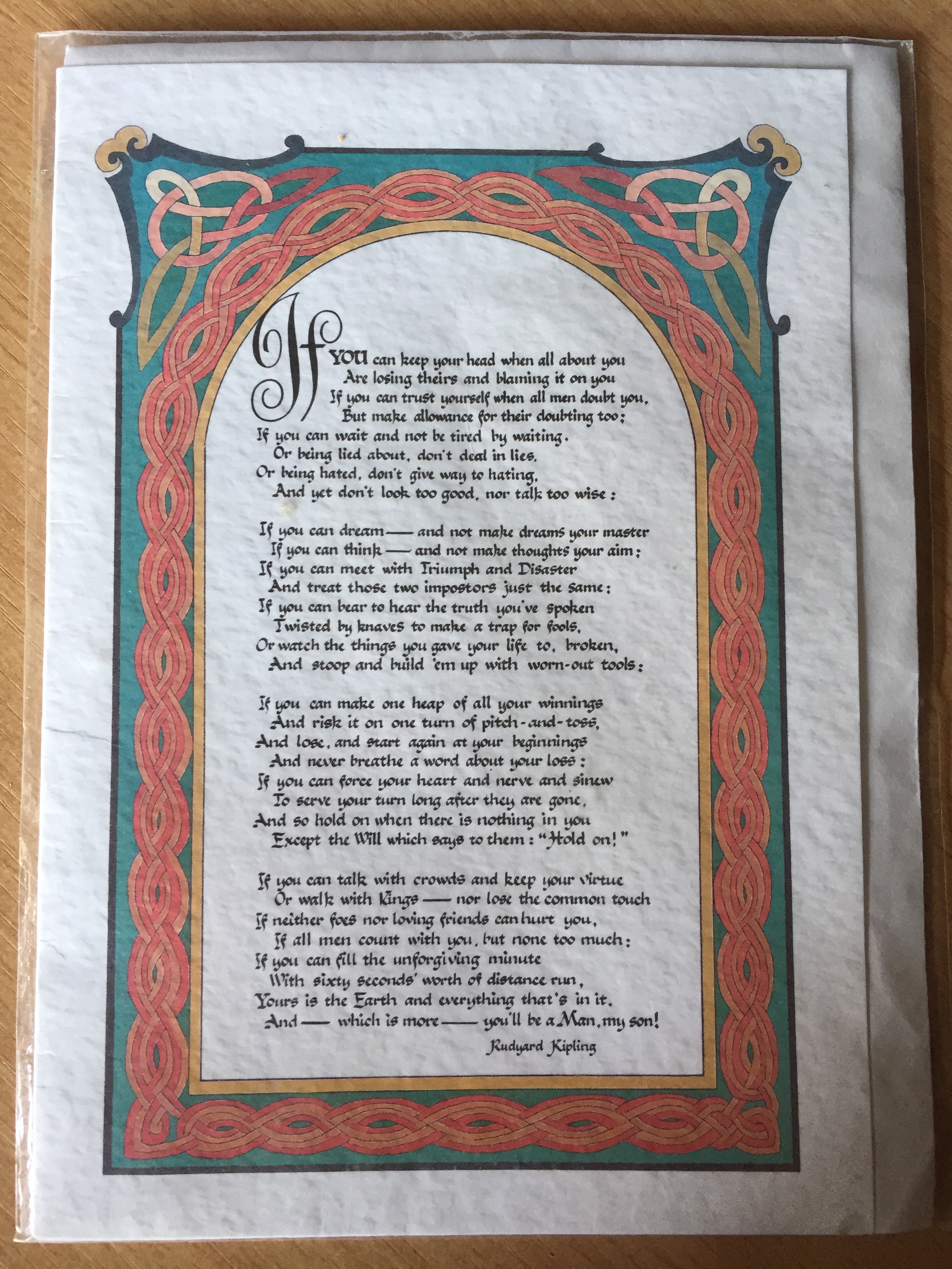 I really can’t think of a better poem for a housemaster. The virtues Kipling offers up (an edited selection above) are just as important today as they ever were, and if I should follow that path myself someday, I too will have a copy of this verse in my office. For myself, if not for my boys.