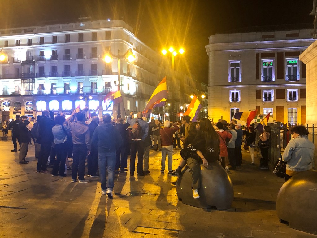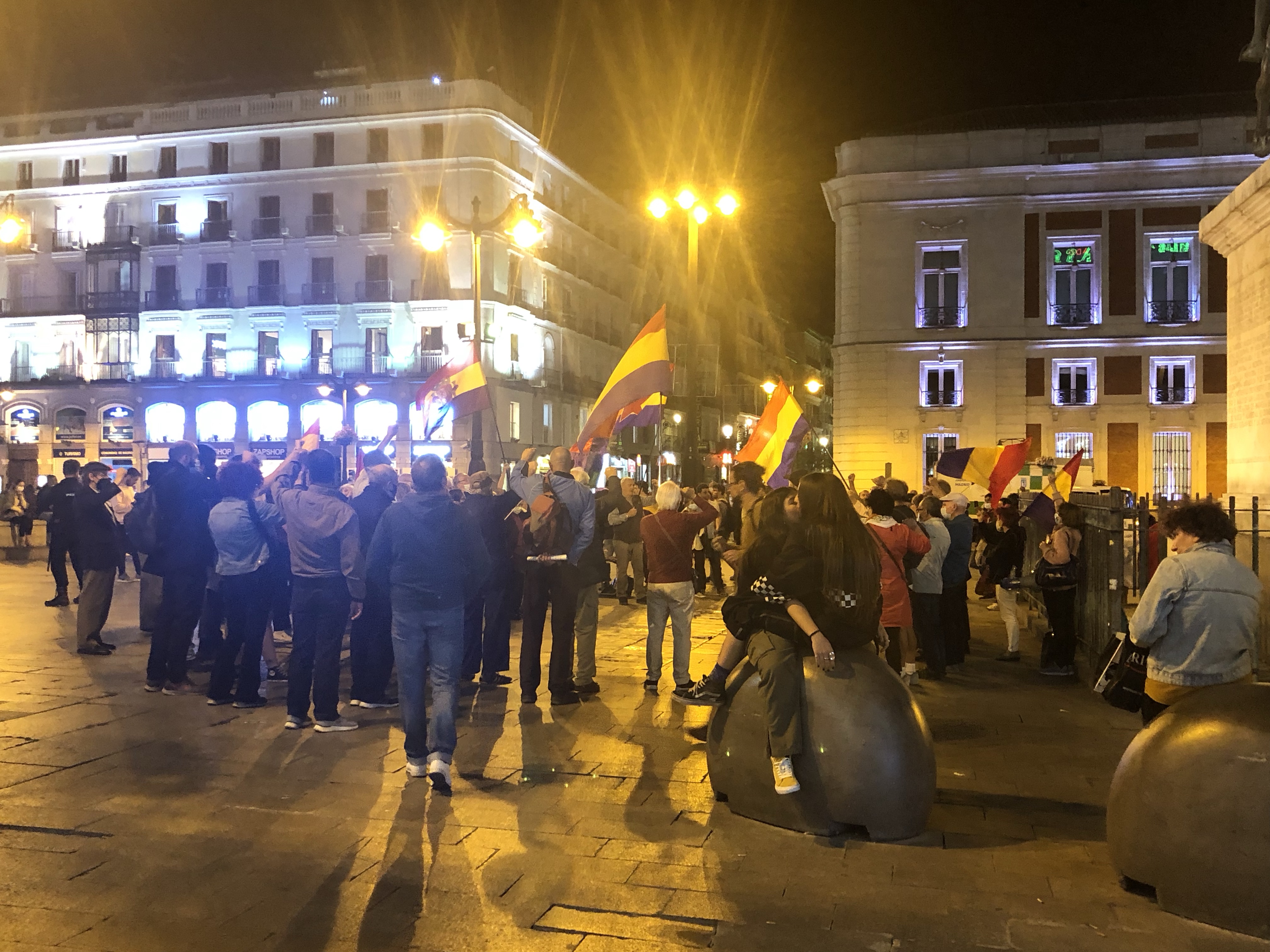 The last time I saw a demonstration like this was back in October in Madrid’s Puerta del Sol, as I walked back to my hostel with one of my cousins. “They’re always here,” he told me, “and so are they,” indicating the loitering policia who hang back just shy of the crowd, silent, hands on their truncheons, watching the Republican flags flying in the night air. The crowd was surprisingly mixed: an old man in a flat cap stood shouting his passionate support in the centre of the throng, while two girls shared an equally passionate and equally political moment on one of the bollards. The policia watched on, silently.