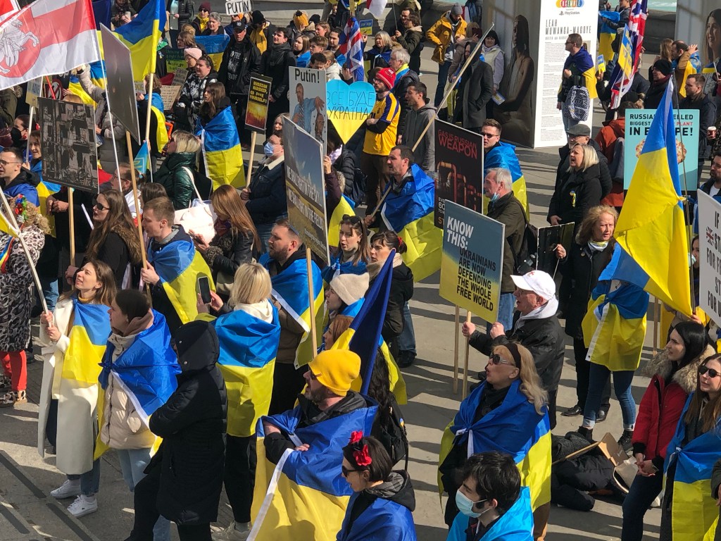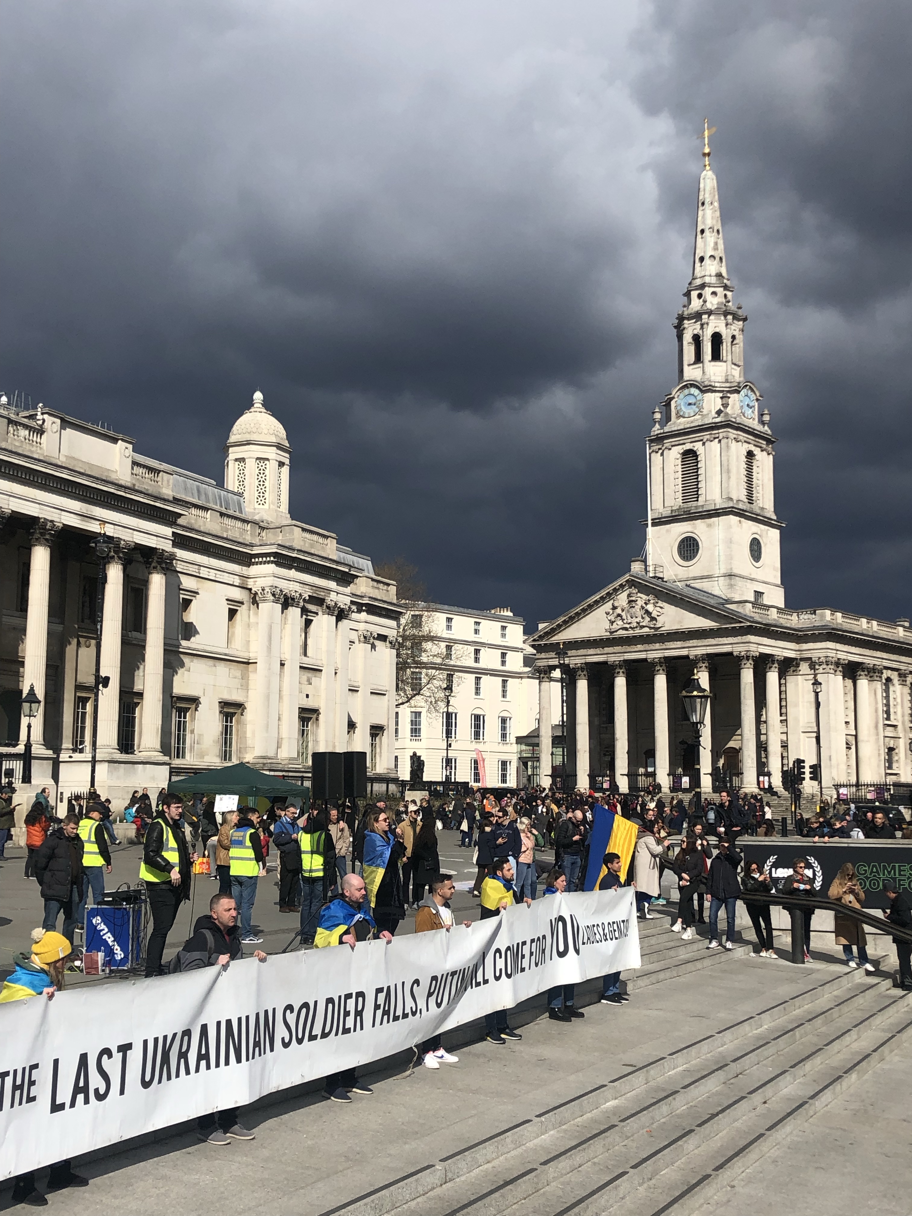Those were the chants, coming around and around before the crowd. The main speaker apologised for the necessity of being so blunt, before decrying the rape of Ukrainian women by Russian forces and the slaughter of its children. An Englishman spoke slightly hesitantly about the need to support Ukraine’s disabled and elderly refugees, and a Ukrainian began to sing a national lament as the sky darkened overhead and the sun faded from sight. I’ll admit I half expected there to be a police van lurked nearby, its officers on standby for any disruption, but I couldn’t find a visible copper for love nor money.