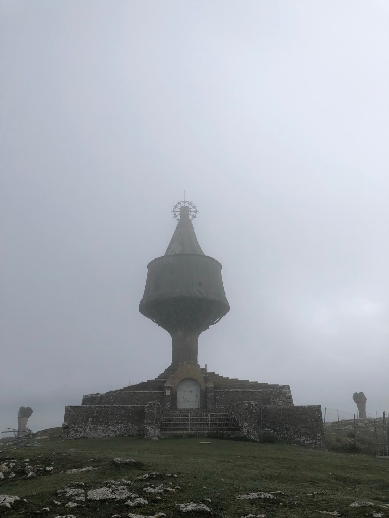 At first, the rolling clouds shrouded all but the peak upon which I was standing from view. I could just about make out the bizarre sculpture to an apparition of the Virgin Mary in the form of a colossal concrete block supported by a stylised tree looming out of the mist, but it looked like it had been fenced off and graffitied for good measure long ago.