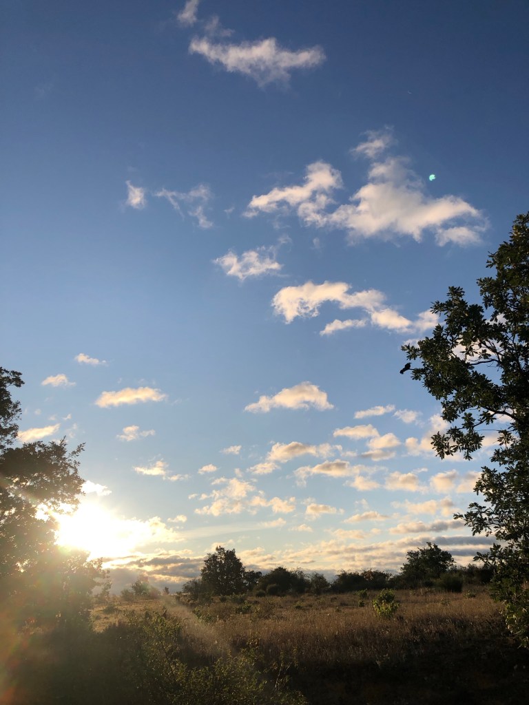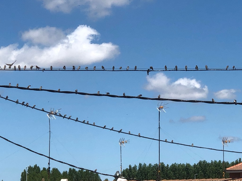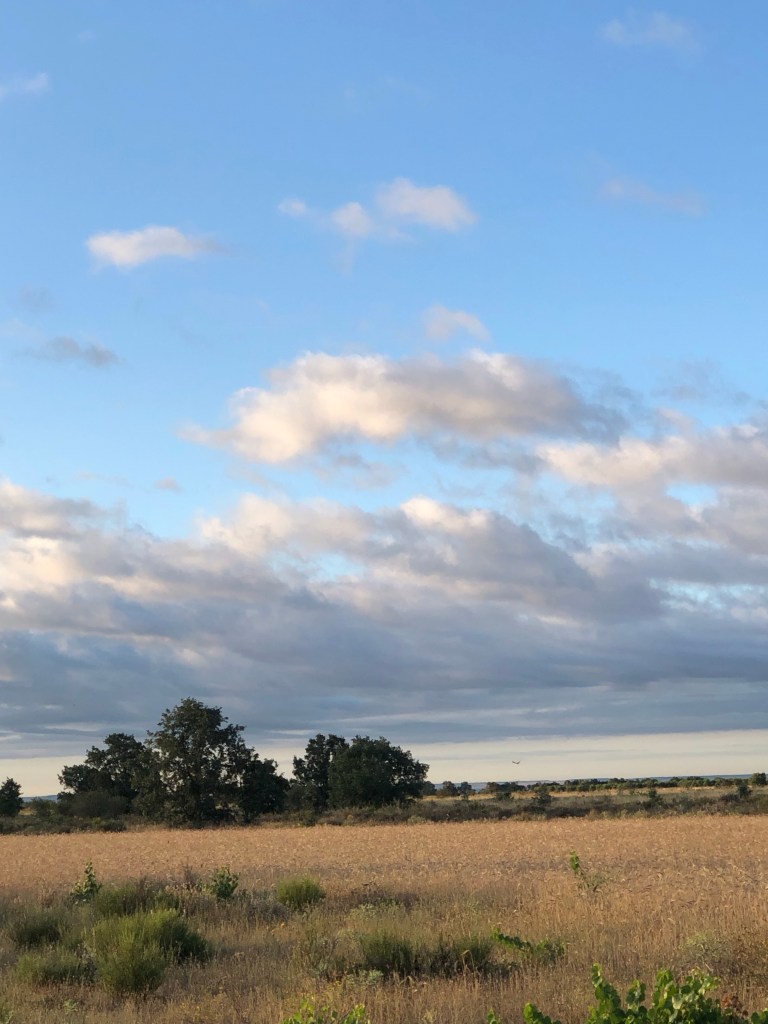 Better yet, the first hour after sunrise yielded some of the best birdwatching yet on the Camino. The usual backdrop of quail, turtle dove and stonechat provided some musical continuity to the meseta movement, with a colourful inclusion of golden oriole, blackcap and nightingale. There were quite a few kites about, whistling in that very plaintive way they do, and the calls of bee-eaters will never fail to make me smile. While I can also add great grey shrike, honey buzzard and whitethroat to my list this morning, I think it was the fleeting encounter with a greater spotted cuckoo that was the standout from today’s walk, tearing ahead through the scrub in front of me as I neared the first town on the trail, Chozas del Camino. As usual, a phone camera is next to useless for this kind of thing, but I did manage a snap before it was gone (look to the right of the second tree from the left).