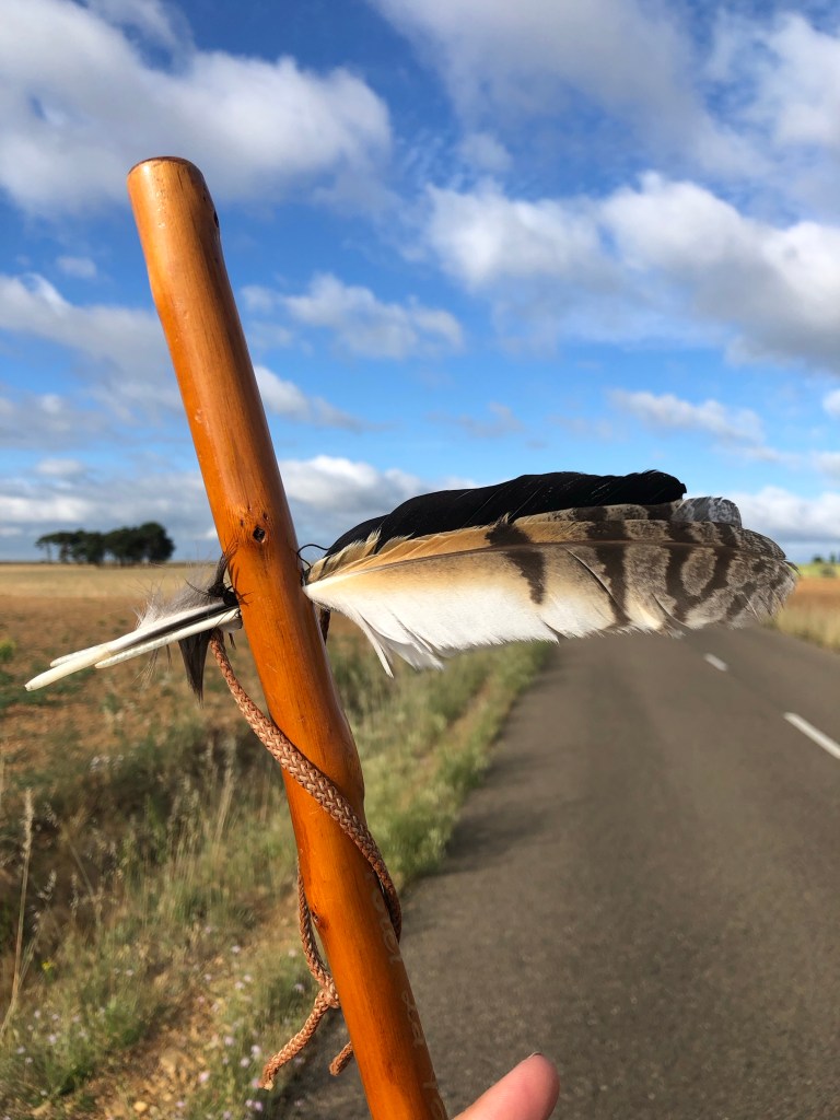 After narrowly avoiding a major desvío at Chozas, I followed the road to Mazarife for the next hour or so. Along the way, sensing rather than smelling death, I guess, I came upon a mass of feathers at the side of the road. On closer inspection, it was a long-eared owl, and a relatively young one at that. Given its condition, it must have been hit by a car less than a day ago, or else it would have been devoured long since. Acting on an intuition beyond simple curiosity, I picked up two of its wing feathers and fastened them alongside the raven feather to my staff. Besides the fact that owl feathers are one of nature’s most intriguing artefacts – they are engineered to move silently through the air – I think my desire was to give the unfortunate creature (a migratory species in most parts of Europe) one last journey, as it were. I will carry them to Santiago and Finisterre… and beyond, if I can.