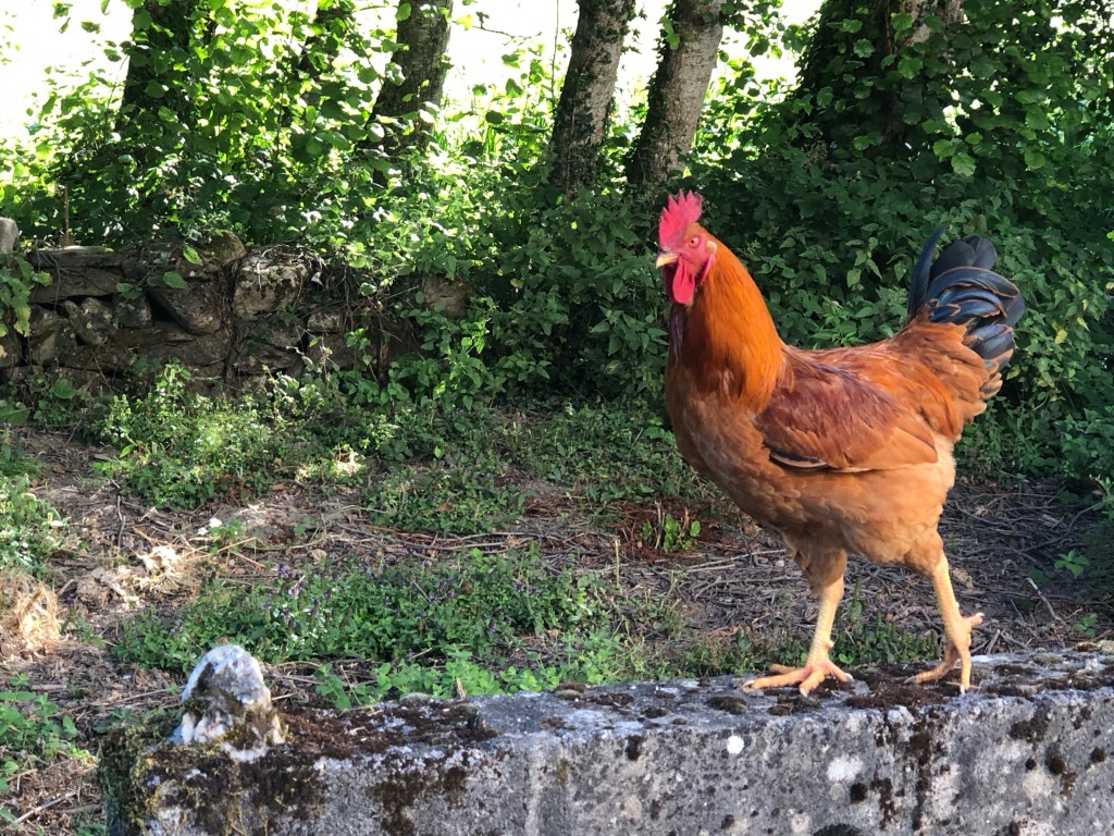 It wasn’t easy to catch on camera, but I found considerably more willing subjects in a gang of long-legged Spanish chickens further up the road. The way they were going, they looked as though they might have been making the pilgrimage themselves! Though I was briskly disillusioned when the rooster started sizing himself up to me, squaring off like a boxer in a title fight. Feeling a hard pass on letting him test his spurs on me was a good move, I left them be.