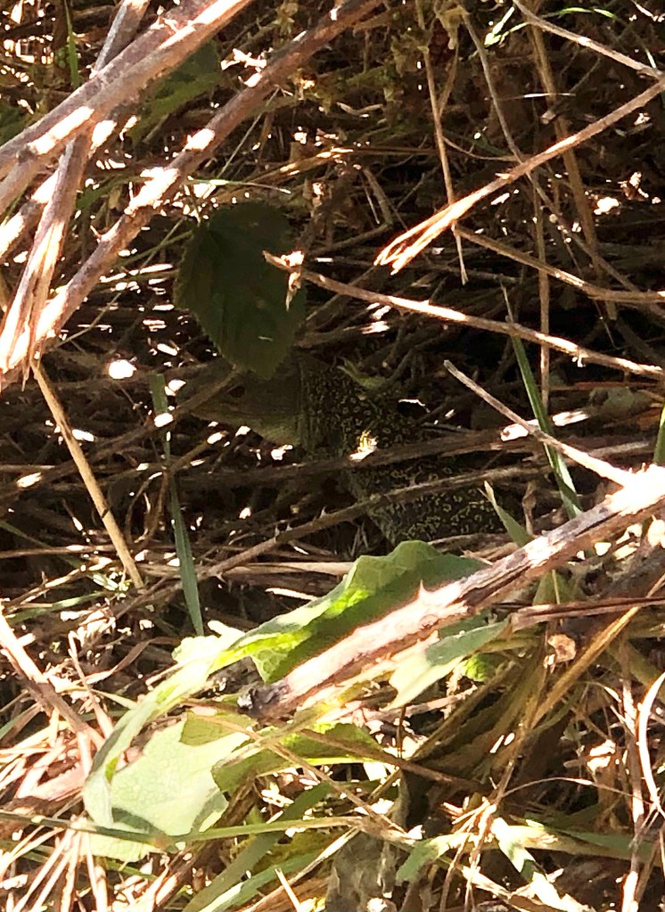 After La Faba (where the fountain water is so deliciously cold that my bottled water needed jettisoning immediately) the Camino climbs ever higher through one last stretch of forest and then up into the sunlit highlands of Castilla y León’s final outpost. I must have gone on ahead of the others, because I only passed a few intrepid pilgrims up here. It might not have been heatwave material, but the sun was high up by this point and the lizards were out, including the giant green occelated kind that used to fascinate me as a kid. Most of them were well under cover before I saw them go, but one lingered long enough for me to see where it was hiding. Can you see it?