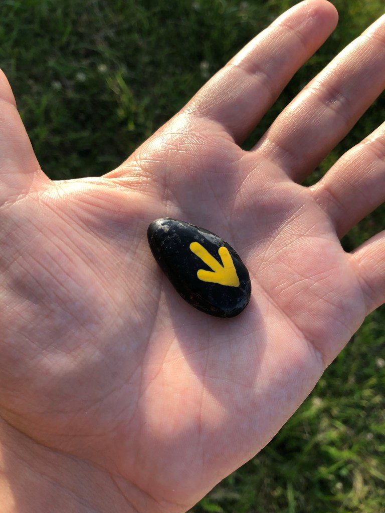 As a parting gift, the priest gave us each a little stone with the yellow arrow of the Camino. I’m holding mine now, its tiny yellow arrowhead forking through my fingers to the northwest.