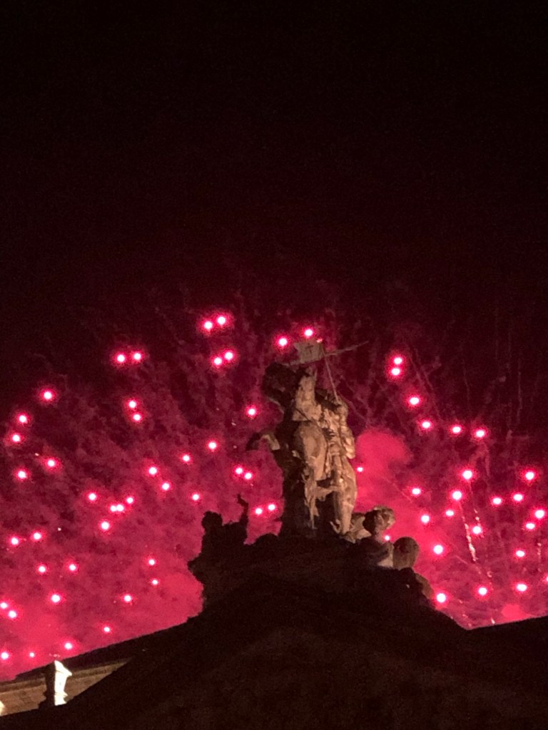 After all that build-up to the grand firework display on the night of the 24th, the pilgrim party in Santiago was a little underwhelming. I suppose, like most things, it simply couldn’t live up to the hype. In some years, the entire facade of the cathedral is lit up with a phenomenal son-et-lumiere show while pyrotechnics close the fifteen minute performance. This year, however, the fireworks were set off from six different points around the city – but not the Praza do Obradoiro. I’m glad I gave up my three-hour vigil and went back to the albergue for something to eat at ten thirty or else I would have been pretty cranky! Fortunately, though almost all the fireworks were obscured behind the huge Concello building (meaning the crowd which had previously filled the square wound up massed into a thin wedge overlooking the park) I managed to find a good angle to remedy the situation.