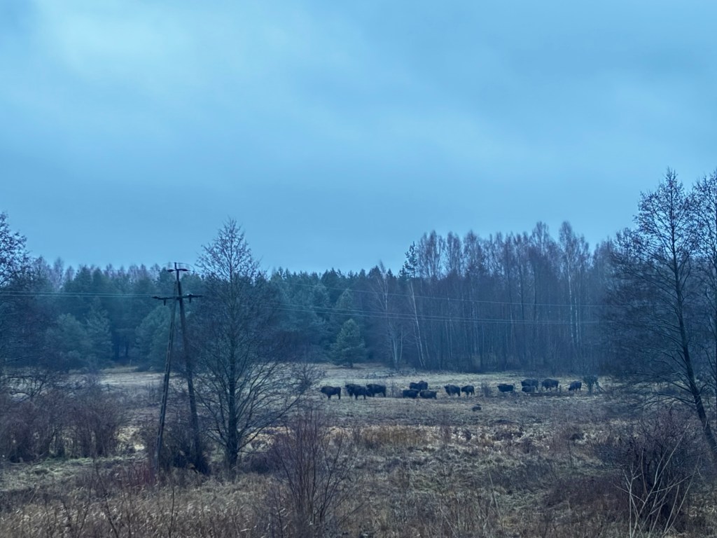 We agreed to try for the bison once again, after our lucky encounter with the wolves the day before. We found the herd even faster than on the first morning, grazing in a field just outside Narewka. They seemed unapproachable at first, but Łukasz had a better idea.