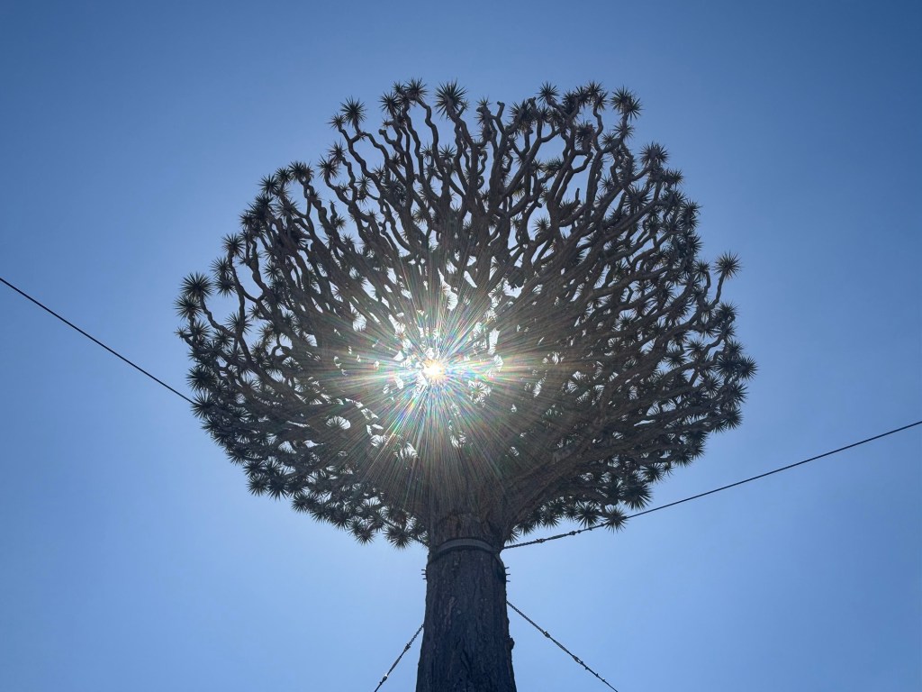 Higher up the mountainside stands another dragon tree, el Drago de San Antonio. Younger than the drago milenario (but only by a few hundred years), this one is chained in place like a wild beast. It’s also guarded: two security guards in green overalls sat in the shade nearby, smoking a cigarette and watching me as I wandered over to have a look. There’s a motive for their caution: the tree had been ‘attacked’ twice in the last fifty years, first by an ambitious landowner who wanted it cut down and more recently by vandals. To ensure its safety, cameras have been installed in the neighbouring walls and a guard posted during daylight hours – not to mention the chains. I can only imagine these last have been affixed to keep the tree in place should the dormant dragon within decide to take flight someday.