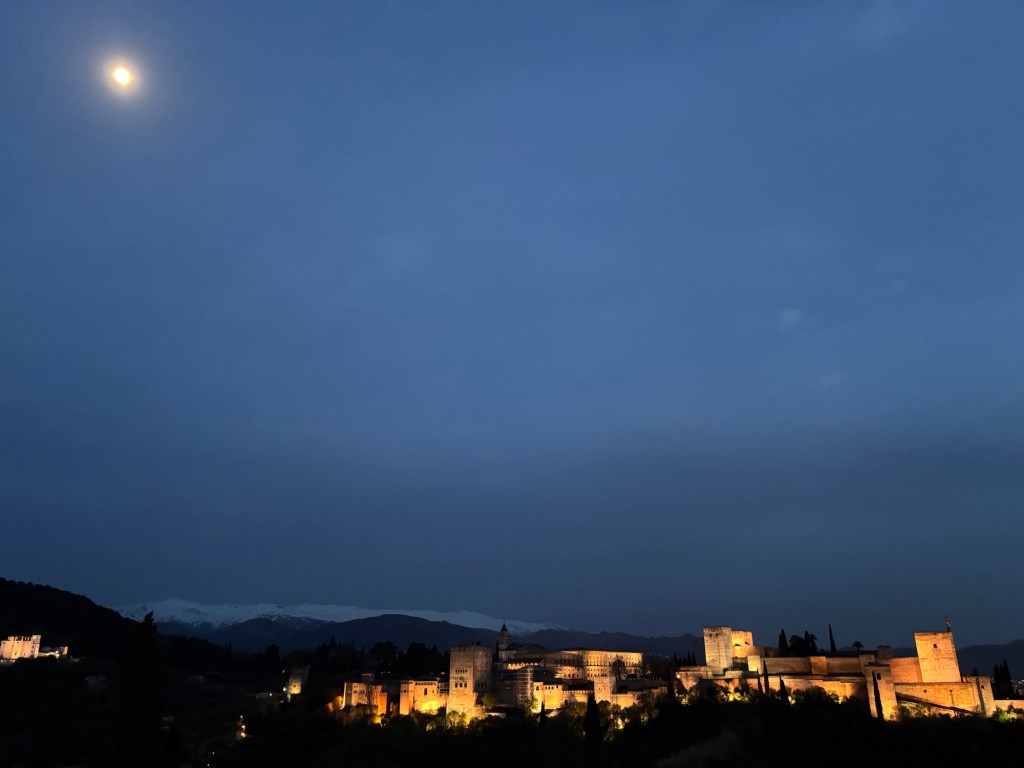 I must have been there for at least half an hour, because when I was finished sketching the moon was up, the Alhambra illuminated and the city lights twinkling away in the gloom of the vega below like velvet. I relinquished my spot on the wall and set off for my pensión.