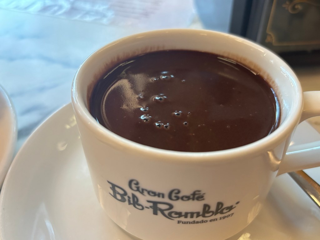 This morning began with a side of churros con chocolate at Café Bar Bib Rambla, an old haunt of my mother’s when she was on her travels around Spain back in 1988. It was just as good as she described it. Churros are definitely a once-a-year treat – I can’t quite justify any more than that – but Spain’s fondness for warm liquid chocolate is definitely something I share. I needed to kill some time (and break down some paper money into loose change) between the wash and dry cycles in the laundromat, so it was good to kick back and relax in a café that has stood the test of time.