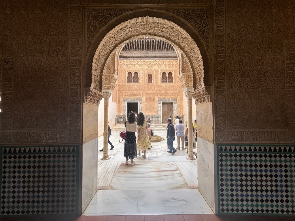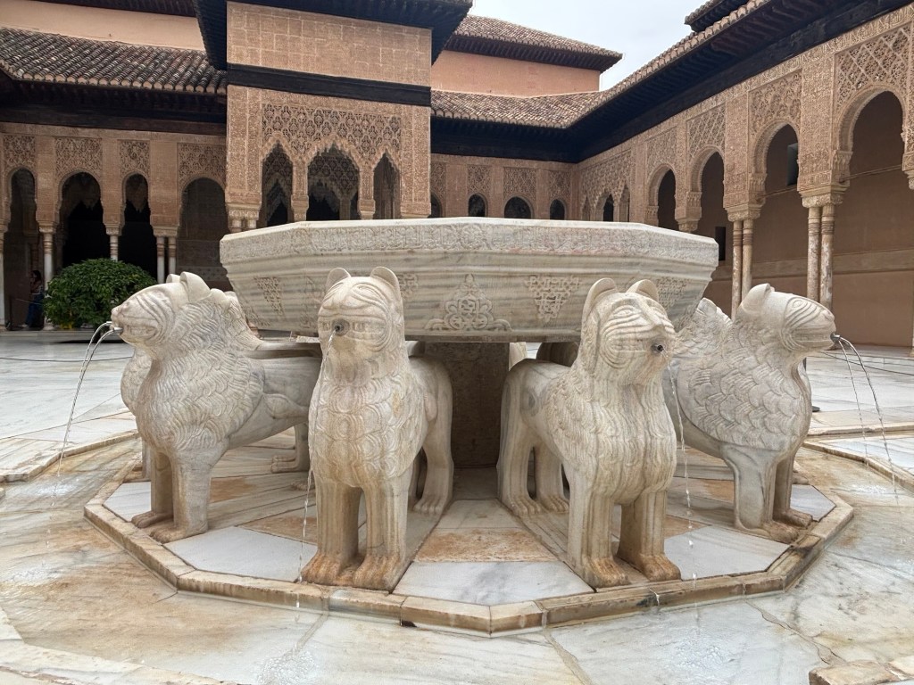 I’ll tell you what was jolly nice, and that was seeing the Court of Lions. It was under heavy scaffolding when I last came here in 2011, so it was the only first-time experience I had on the tour. This enigmatic feature of the Alhambra really stands out, especially as depicting the physical form is usually proscribed in Islam. The fountain and its accompanying lions have long been a symbol of the Alhambra, though they were a late addition to the complex. It’s thought that they weren’t Islamic in origin at all but rather Jewish, as the fountain is believed to have come from the house of the Jewish poet Yusuf ibn Nagrela. The logic checks out: there are twelve lions in all, one for each of the tribes of Israel, and two bear the triangular insignia of the tribes of Judah and Levi on their heads.