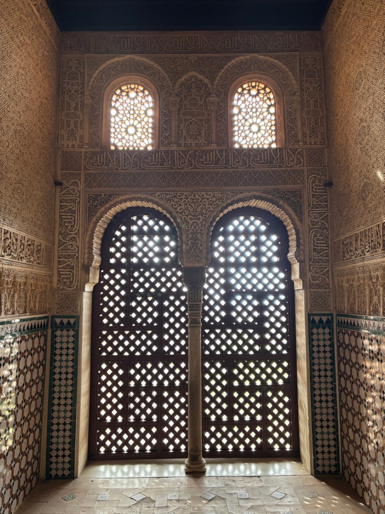 Once, this place was even brighter. The faded beige stucco on the walls would have been covered in a rainbow array of colours, some of which can still be seen in the cracks in you look close enough. The lavish gold leaf and furnishings are, of course, long since gone, stolen by treasure hunters from the time of the Sultanate right up until the late 1800s. There were once carpets and drapes all over the place, too, but these were removed by the conquering Spanish as a fire hazard in an early concern for health and safety. I remember reading somewhere that they also had the floor lowered as the windows were too close to ground level, but don’t quote me on that. The Alhambra has been restored and modified so many times since its construction that it’s probably a far cry from what it originally looked like: a ship of Theseus or Washington’s axe, depending on which take on that metaphor you prefer.
