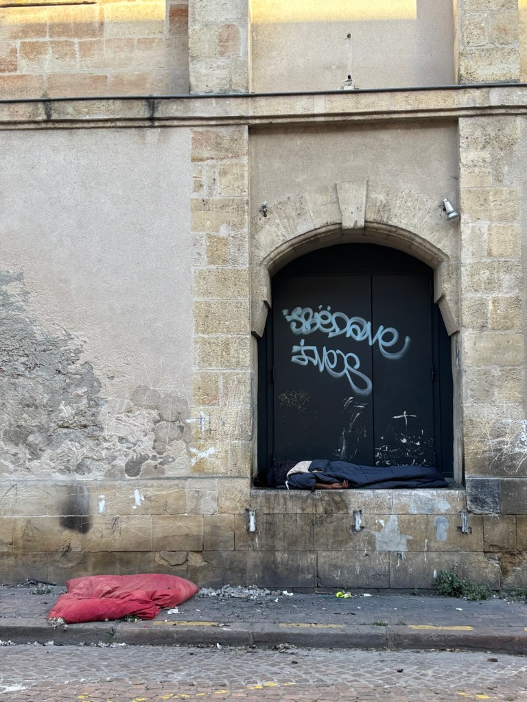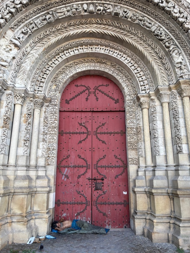 I was so enthralled by the stonemasonry on the portal of one of Bordeaux’s churches that I almost didn’t notice the man sleeping in the doorway. He looked like a dead ringer for a down-on-his-luck Alexandre Dumas. The way he was stretched out in sleep, he might have been a fallen detail from the paradise arches, come to life.