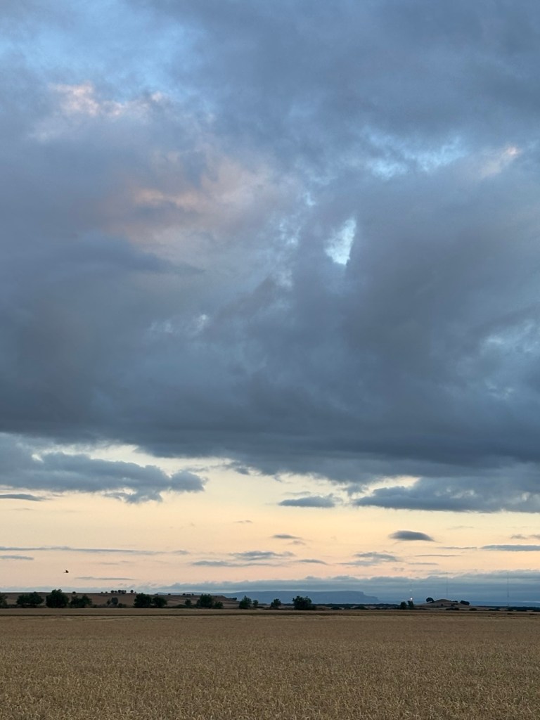 The hospitaleros at Hornillos left out a proper spread for breakfast, so we ate well today. Even so, we were up and gone by 6.20am, shortly before sunrise – which is getting noticeably later each week. The turbines on the surrounding hills continued to spin in the twilight, their red warning lights blinking like eyes along the blue horizon.
