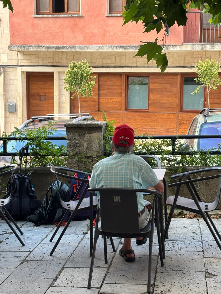 I rejoined the Americans at Castrojeriz and we grabbed a drink before lunch, partly out of curiosity to see whether Gust could extricate himself from the photographer’s grip. We were more than a little surprised to see a MAGA hat, but nobody dared to engage the man in conversation. If he was a pilgrim, he was traveling very light indeed.