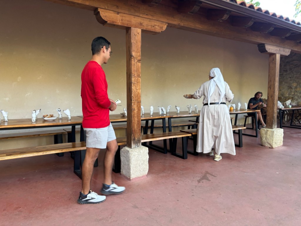 And who should have arrived at our albergue at the last minute but our melon thief! He was conspicuous in his absence from the preparations and did not lift a finger during the clean-up operation, plugging in his earphones and retreating to the other side of the table – present but idle. Not only that, but while the nuns were saying a prayer, he got up and helped himself to seconds and then thirds of the soup the nuns had prepared.