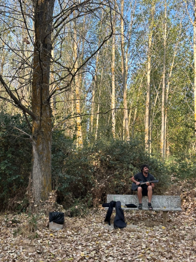 We passed Bercianos early and most things were shut, after which I started to get itchy feet and took off ahead. Along the way I heard the strumming of a guitar in a slim stretch of forest – a brief oasis in the golden fields of the meseta – and there I found Steven, a Chilean-South African who we haven’t seen for about a week. He’d found a solitary spot beneath the trees where the orioles sing to play his heart out. That’s something I’ll admit I’ve been missing a bit in this fun but busy Camino.