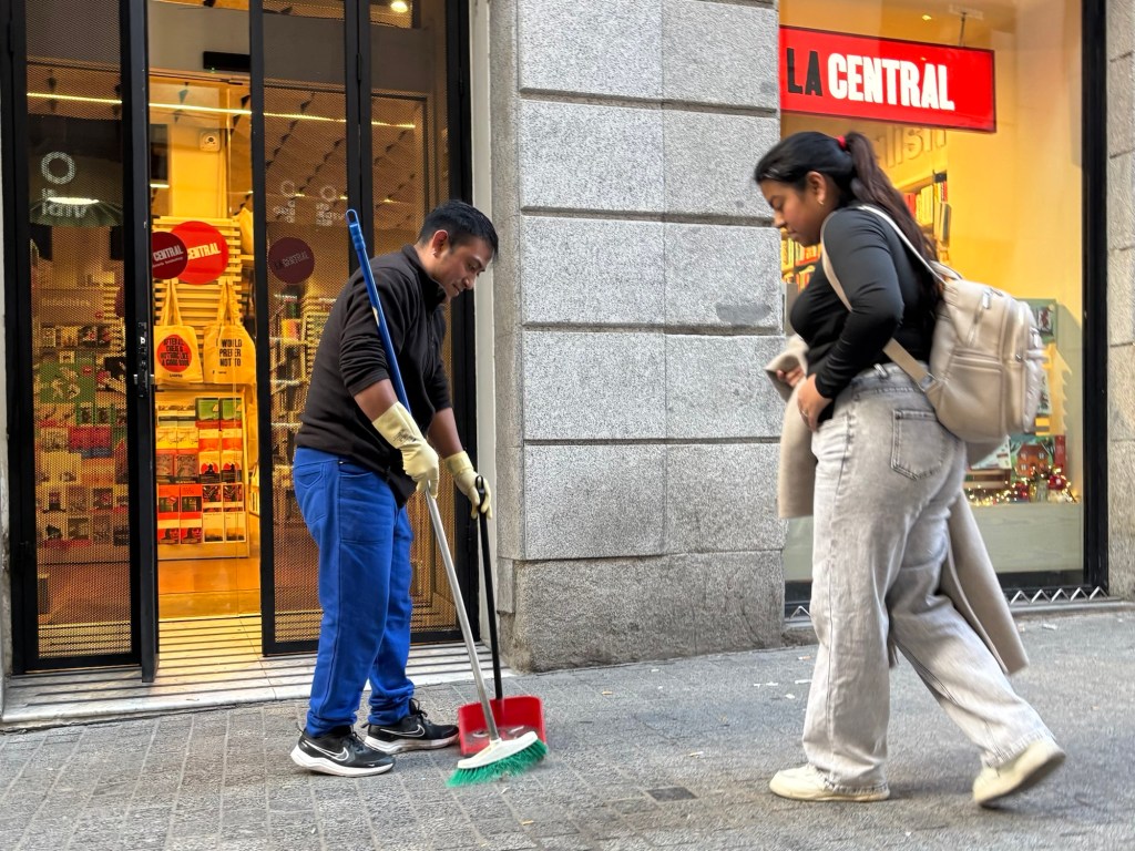Further up the street toward Gran Vía, I pass La Central. It’s not yet open, and an Amerindian in marigolds and workers’ blue pantalones laborales is sweeping the street in front of the door, which is open only just enough for a person of slender build to squeeze in untouched. It’s mostly confetti and spent chasquibumes that he’s clearing away – there aren’t nearly as many cigarette butts as there used to be.