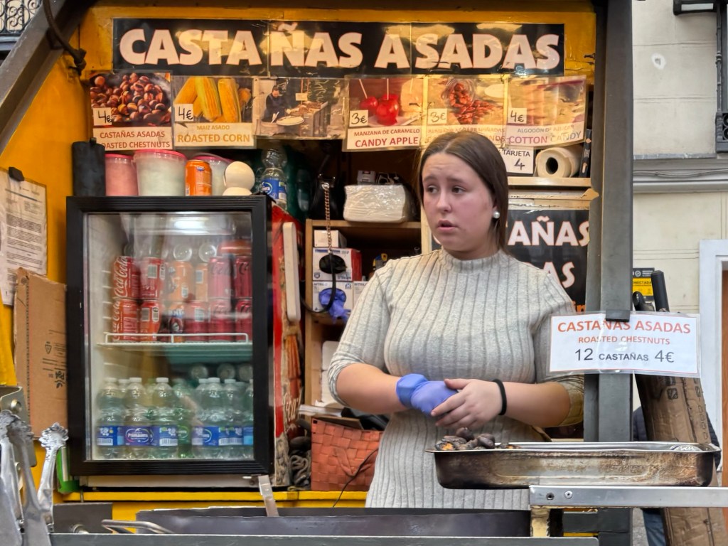 The girl with the pearl earring isn’t as heavily dressed for the chill as the other madrileños in the street – but then, she is standing in front of a roasting dish all morning. She looks bored. The telltale rounded edges of a smartwatch bulges beneath the tight elastic of a sanitary glove on her right hand, and a swish handbag – presumably hers – sits nestled in an alcove behind her, so the chestnut business must be doing a reasonably good trade. I haven’t seen as many people tucking into the delicacy as I have in previous years, but then, it really isn’t quite that cold. Not yet. Not until the peaks of the Sierra de Guadarrama are covered in snow and the north wind blows chill across the plain and into the capital.