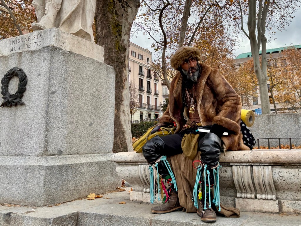 Sitting between the marble statues of the Asturian kings Iñigo Arista and Alfonso I is an exceedingly odd fellow. Like many of the city’s inhabitants, he is dressed in furs for the cold, but the similarities stop there. If the tassels on his black leather buckskins weren’t a metallic shade of blue, he might be a fur trapper from the Old West lost in time.