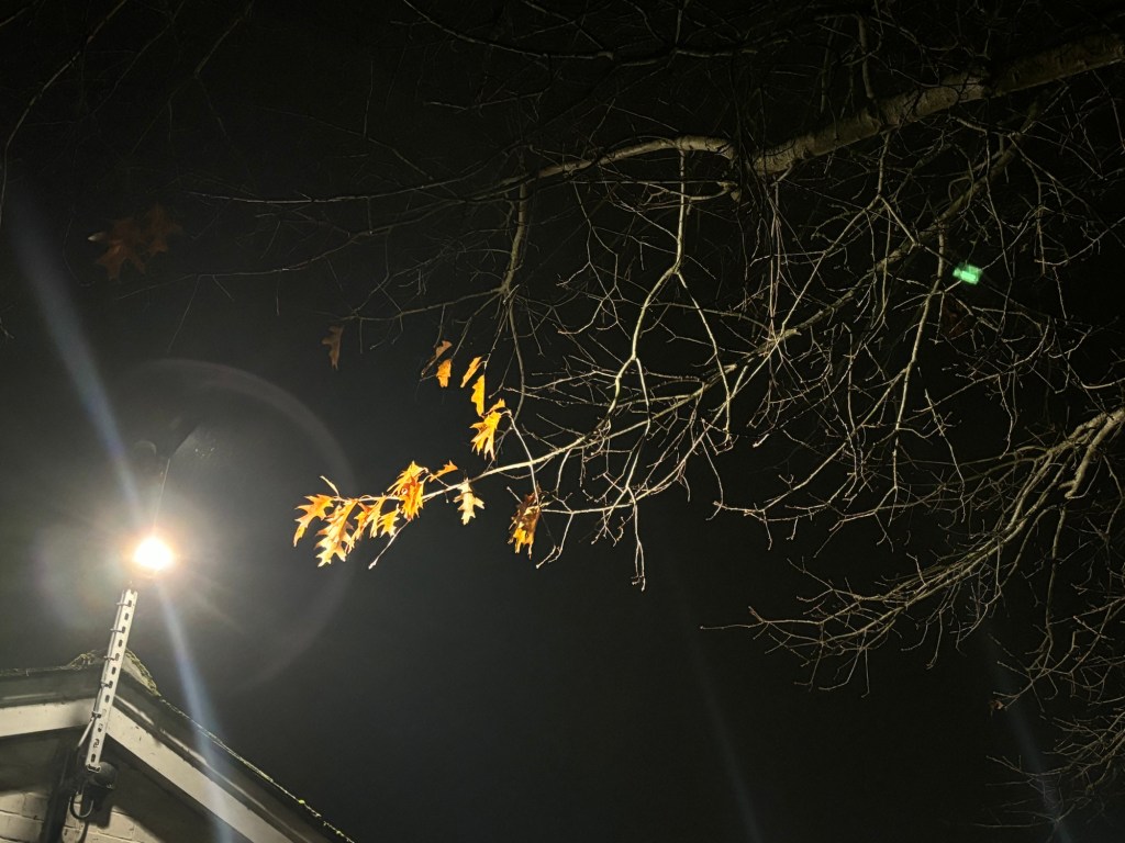 On closer inspection, my little oak has not lost everything. Not yet. A few golden leaves have held onto life, a full fortnight after the rest bowed to the inevitable. It just so happens that they are growing on the branch that reaches closest to the light. I wonder if that is what is keeping them alive.