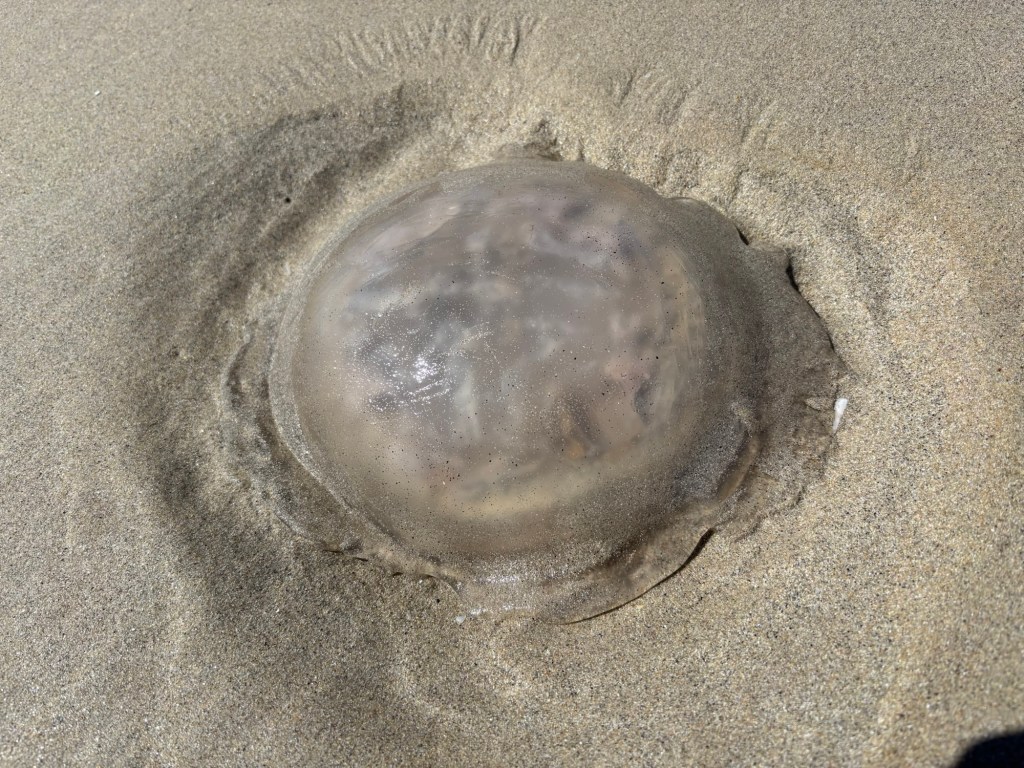 A less fortunate wanderer lies stranded in the sand, glistening in the sunlight: an enormous jellyfish. Not a false jelly like a man-o’-war, nor even a lion’s mane by the colour of it, though it’s hard to say with any degree of certainty, as some marine predator has already devoured its trailing tentacles, leaving the flabby and presumably inedible bell behind. A hollow has pooled about it where the waves have dug it a grave, after a fashion. On the off chance that it might still be alive, I carry it back to the tideline and lower it back into the water. The tide spits it back up again and it lands on its head, motionless. An ancient creature, practically unchanged since a time before life moved over the land, humbled by a force older than the world itself.