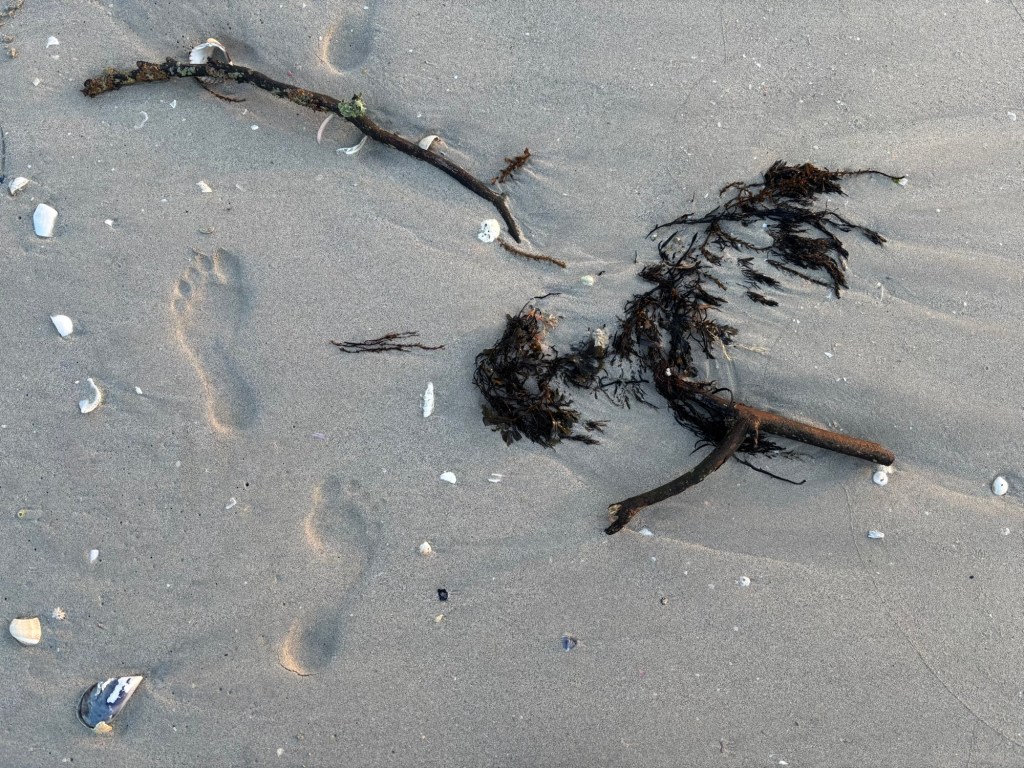 A barefoot pilgrim stood a hundred metres or so ahead of me, turning something over in her hand. Satisfied with whatever it was, she moved further along the beach, stopped, and stooped to pick something up. Clearly, she was looking for seashells. She must have repeated the exercise about eight or nine times before I overtook her. I didn’t turn to see if she had more to find, but I did catch a glimpse of a large collection of seashells in the crook of her arm as I passed.