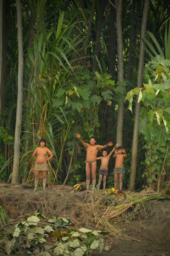 I looked with my eyes first. Sure enough, there they were: brown figures at the forest’s edge, watching us. A man and woman, dressed in little but string and strips of cloth, flanked by a couple of grinning children. They stared at us at first, and then waved enthusiastically in our direction. A fifth child watched from the shadow of the trees, one finger in his mouth, unflinching.