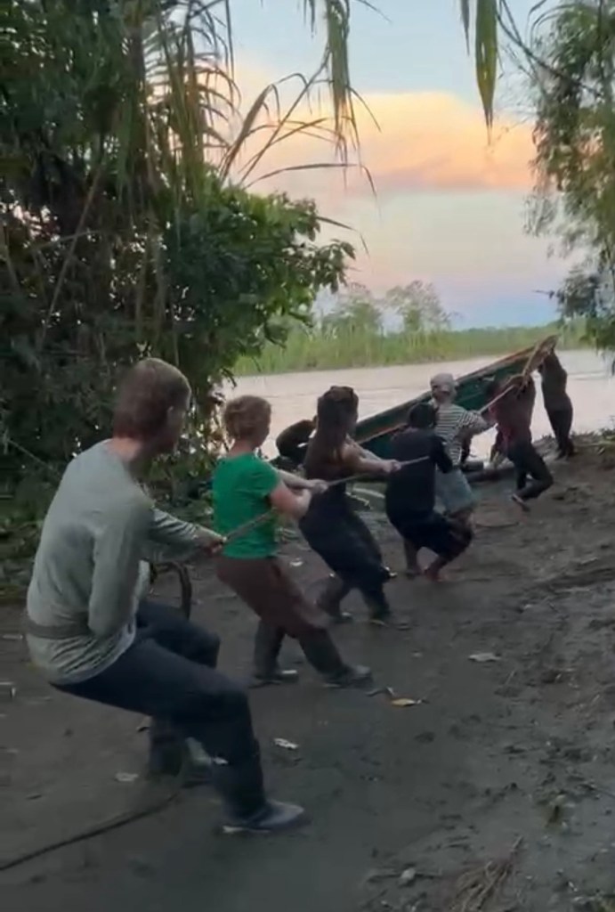 It took a team of twelve men in the water and another support team of gringos on the rope up on dry land the best part of half an hour (and no shortage of pivoting and digging) to get the job done. Led by our captain, a burly native man from Atalaya who engineered a makeshift tourniquet using logs and thick rope to drag the skiff closer to the shore, we eventually managed to haul the fishing boat up and out of the mud. It felt good to be helpful, rather than just coming and going through Manu like any other passive tourist.