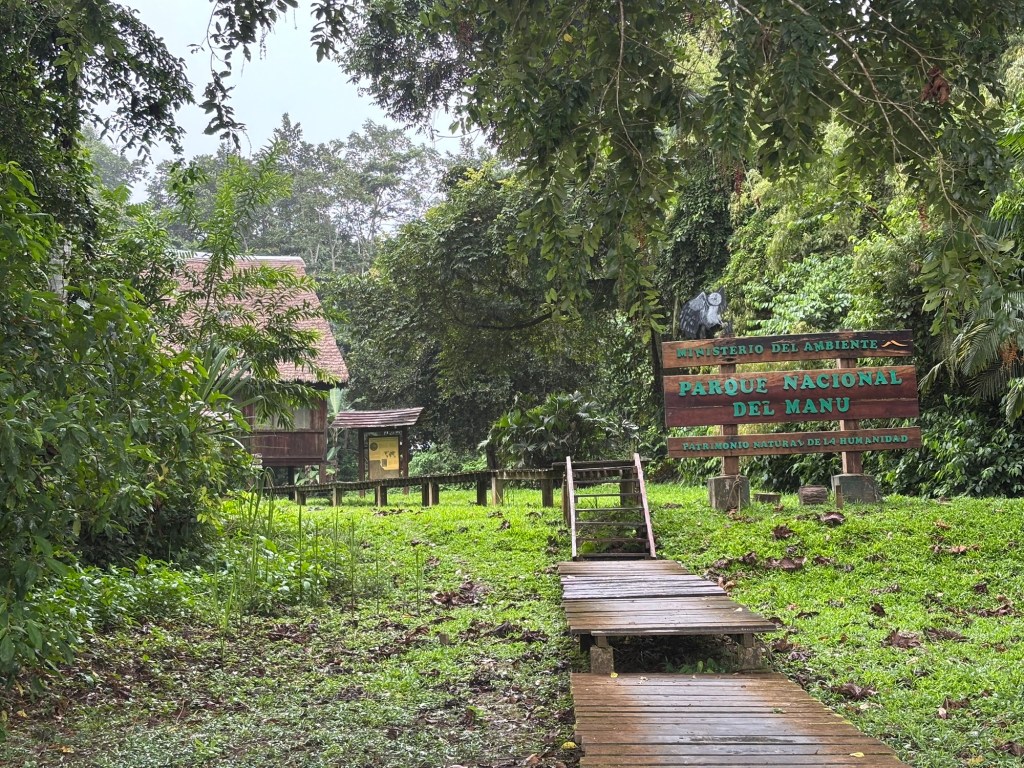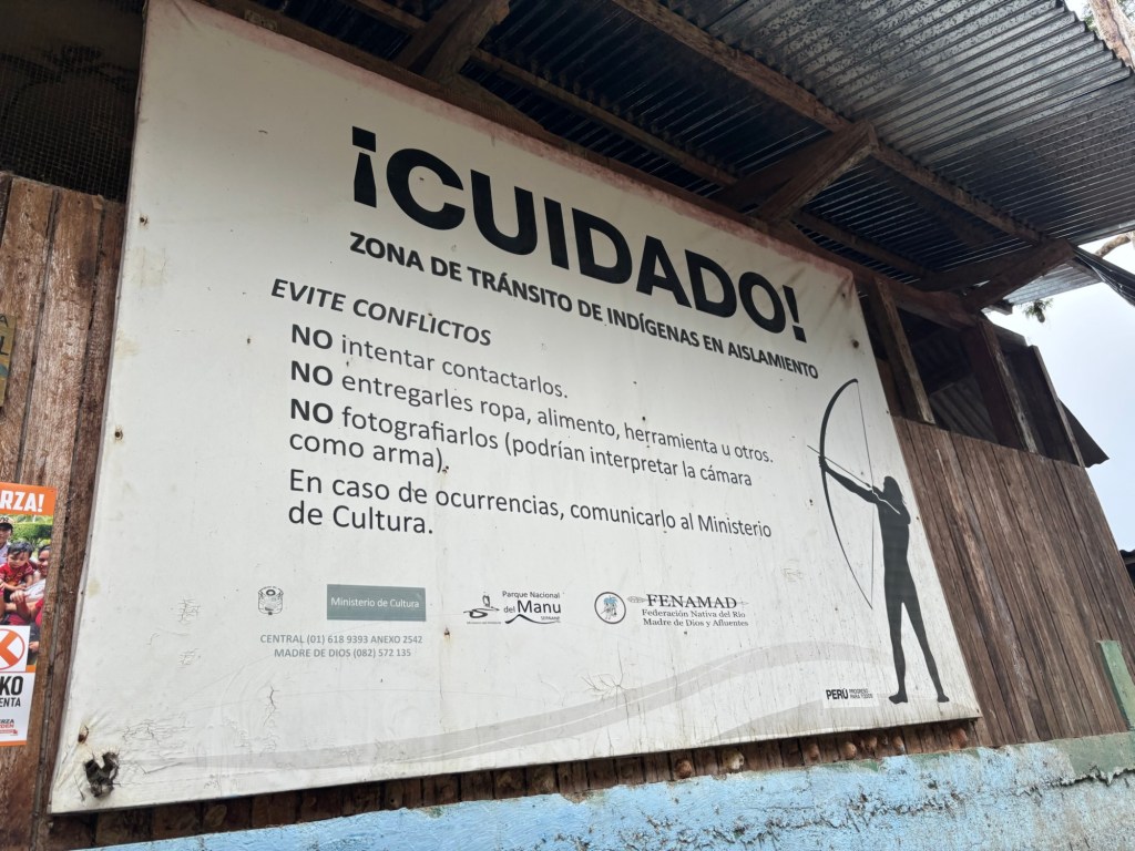 Boca Manu is a world away from Cusco. This largely native community sits on the edge of the national park, where the Manu river meets the mighty Madre de Dios. So fierce is the flow of the combined rivers that the town is steadily retreating into the forest. The jetty is a few slabs of wood fastened to several oil drums with a plank bridge leading up to a tiled section of the riverbank that was once a couple of houses, long since lost to the river. Only the scaffold of a single wall remains, and it has been converted into an advertising post for the local ferrymen.
