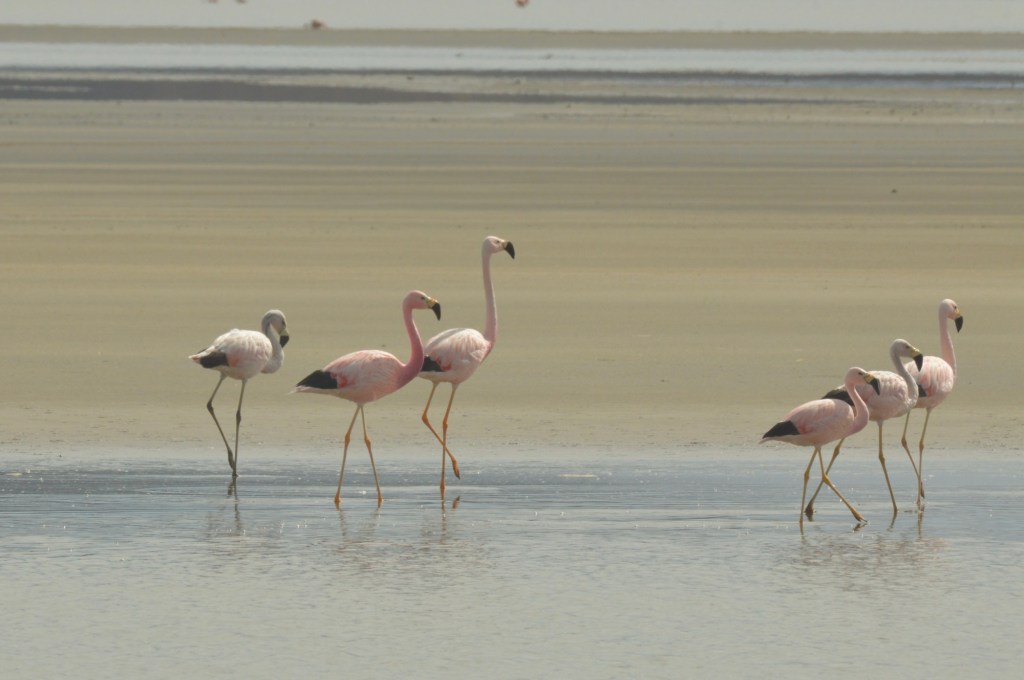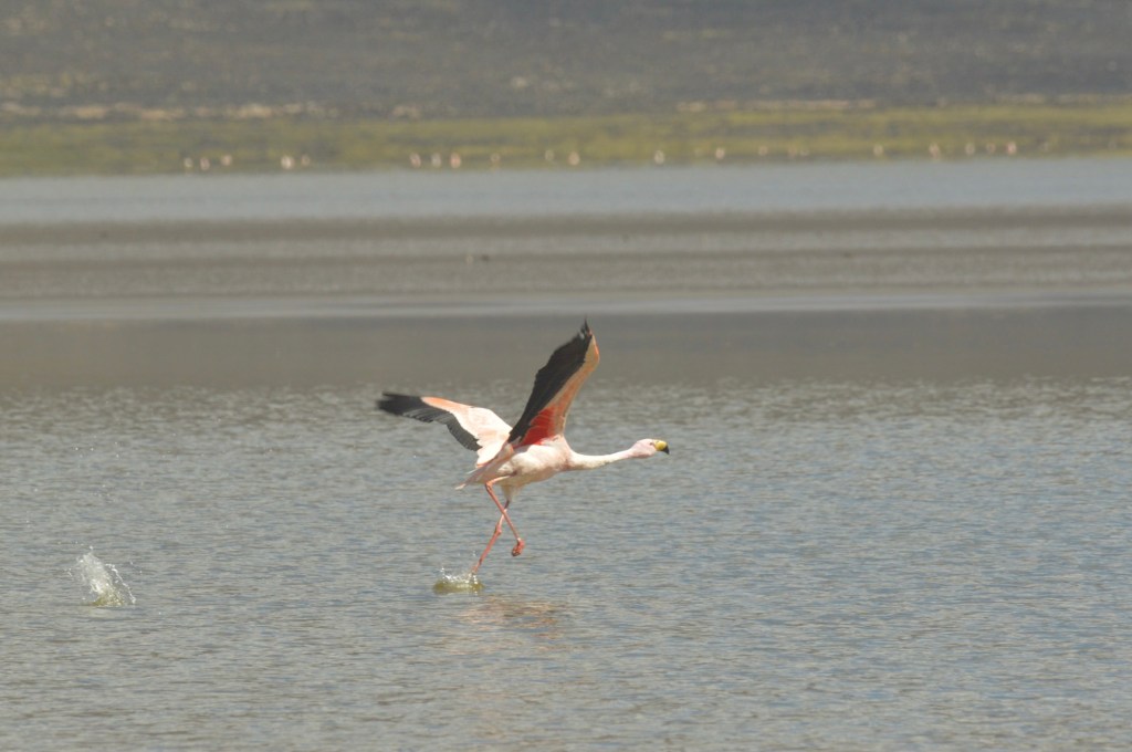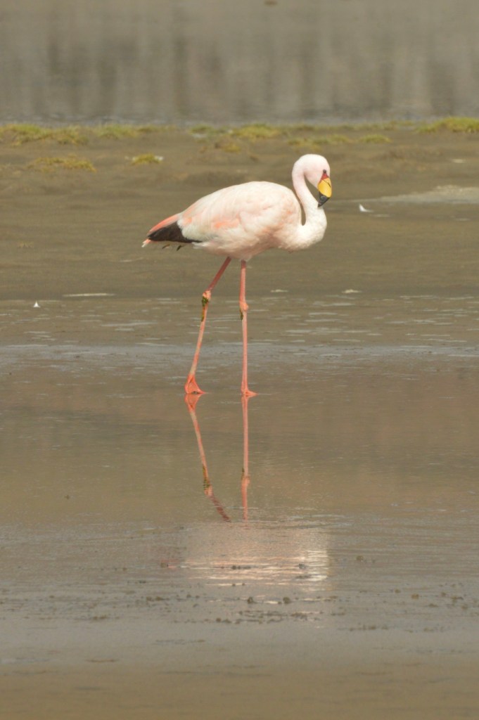 One of the big draws of the Salinas – at least for a naturalist like me – is that all three of South America’s flamingoes can be found here. The red-kneed Chilean flamingoes stayed far out in the centre of the lake, but a few flamboyances (yes, that is the collective noun) of Andean and James’ flamingoes were a little closer to the shore, so I tried to see if I could differentiate them by sight.